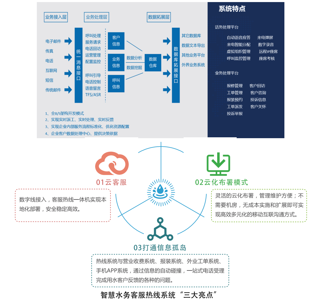 万搏综合登录_万搏(中国)智慧水务客服热线系统,是供水企业与客户沟通的有效渠道,通过统一的对外服务电话为客户提供咨询、报修、投诉、查询等多方面的服务,打造水务管理的“一站式服务”管理模式。系统不仅具备卓越的话务功能,而且具备完善的业务处理功能,实现了与水司各种业务系统的对接,显著提高供水客户服务的效率。