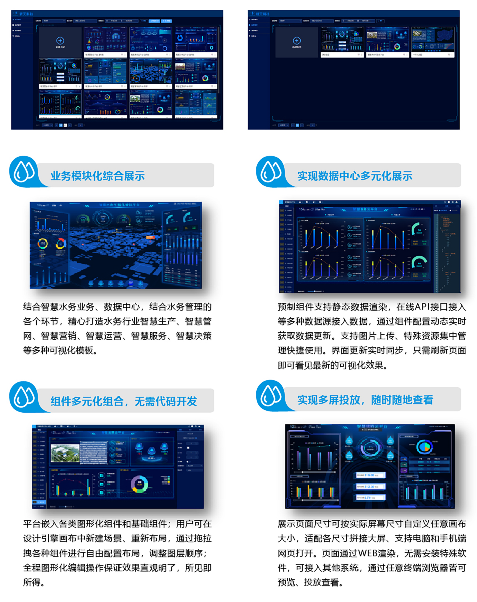 水务可视化平台帮助客户通过可视化应用模块分析展示庞杂数据。将业务数据图形化、形象化,旨在让更多的人直观看到数据可视化的魅力,给企业人员提供简单、易操作的数据可视化界面搭建平台,满足业务监控、数据分析、安全预警、地理信息分析等各行业多业务的展观需求,实现水务企业运行管理的信息化、智能化、可视化和集成化。