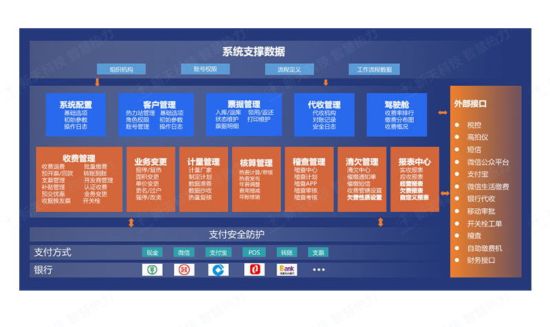 供热收费管理系统基于B/S架构,借助互联网技术,为供热企业打造围绕客户、面积、计量、费用管理为一体的综合信息化平台。对外打通微信、支付宝、银行、柜台等多条服务渠道,提供便捷交费和业务办理通道,以流程为驱动,创建一个闭环的业务信息化平台,对内联动财务及线下开关栓、稽查、清欠等工作,实现各部门业务协同;采用大数据挖掘技术,报表一查即有,为企业运营提供决策支持兼容各地区供热政策,为供热企业的生产和经营提供一站式解决方案,提升供热企业对外服务水平,提高客户服务质量和客户满意度。